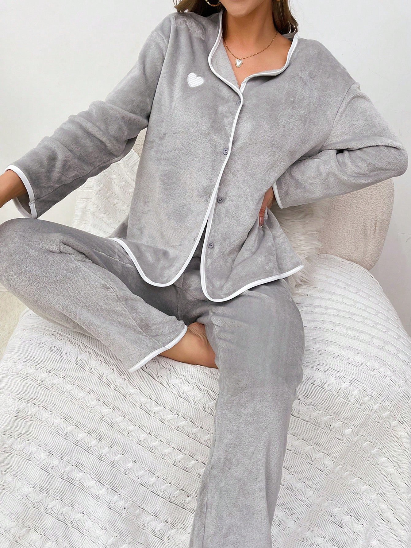طقم بيجامة مريح من ملابس علوية وبنطلون من الفلانيل مع تفاصيل ربطة ملونة، ملابس خريف وشتاء، بيجامة فضفاضة